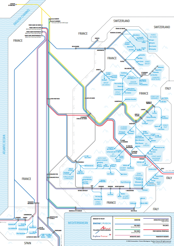 France Montagnes and Atout France, in conjunction with Snowcarbon, produced a dedicated Rail Ski press kit about travelling to the French mountains by train, comprising a unique map that illustrates the entire rail route network between London and the resorts, plus links to four rights-free image libraries of rail travel to the Alps and Pyrenees.